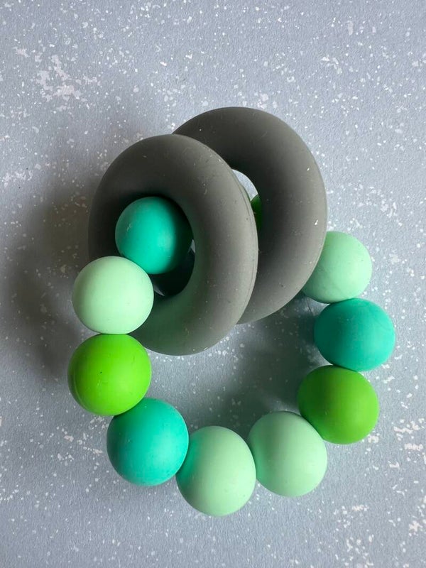Deze bijtring, grijs/groen van kleur, is hand gemaakt met silicone kralen en veilig om door baby`s te gebruiken.