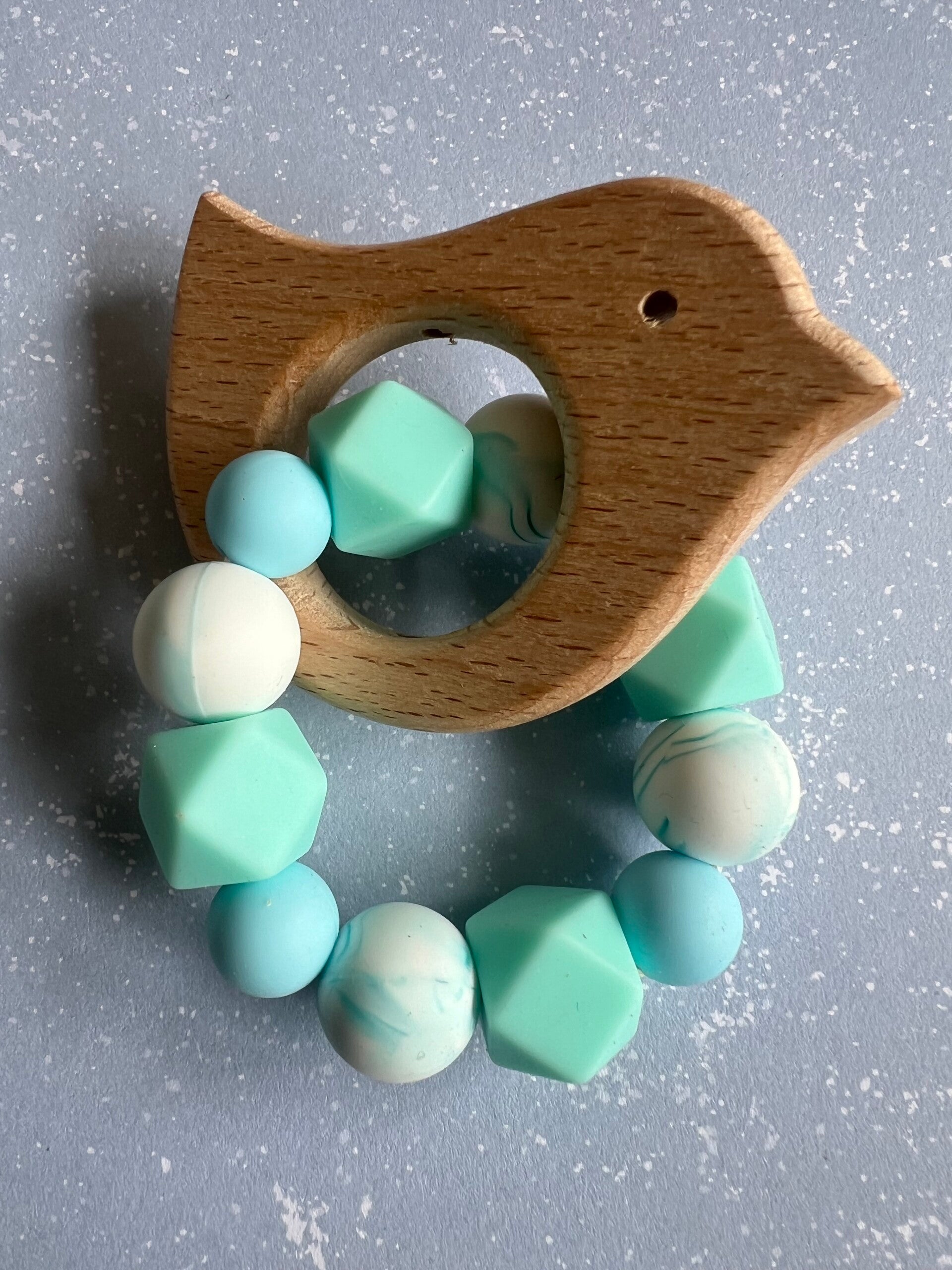 Deze bijtring, blauw/wit van kleur, is hand gemaakt met silicone kralen en veilig om door baby`s te gebruiken.