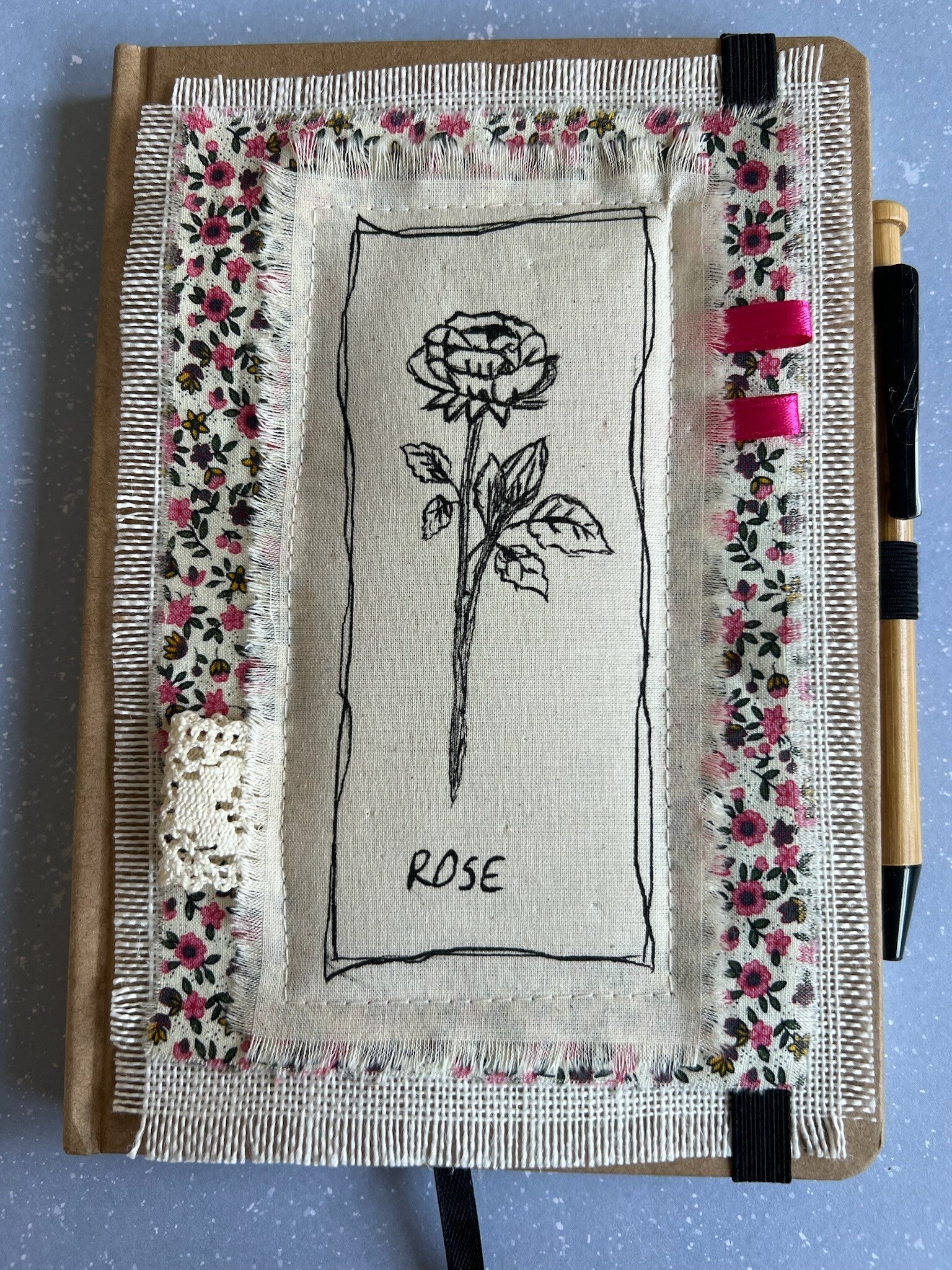 Dit schrift met harde craft kaft heb ik voorzien van een van stof gemaakte voorkant. De bloem heb ik er met vloeibare inkt, oude dip in pen en m.b.v. een lichtbak op het stof getekend. Geleverd met een balpen.