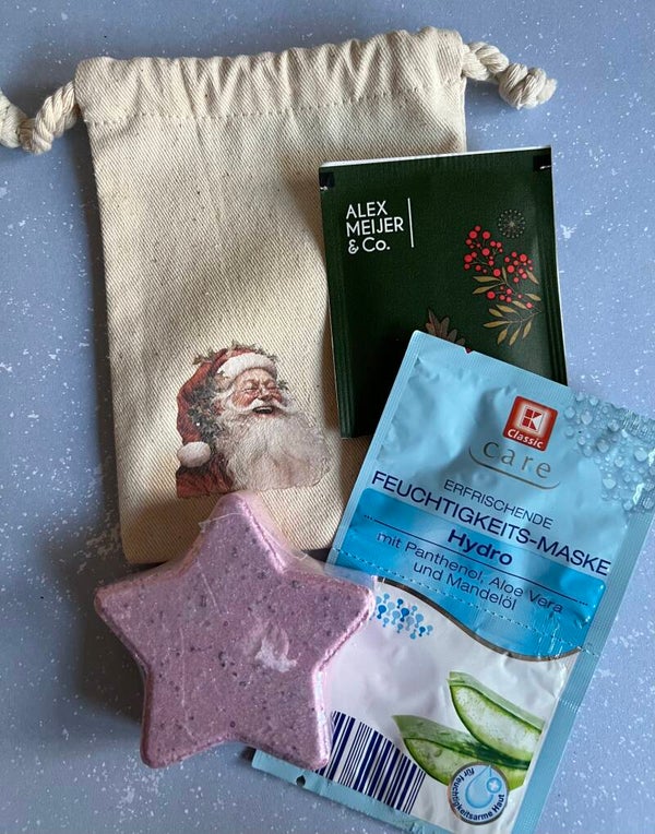 Op dit katoenen zakje staat een kerstman en er hangt een labeltje aan met de tekst:"Verrassing" hierin zit een bruisster, voor in bad, een maskertje en een theezakje. Om iemand een heerlijke verrassing te geven met kerst.