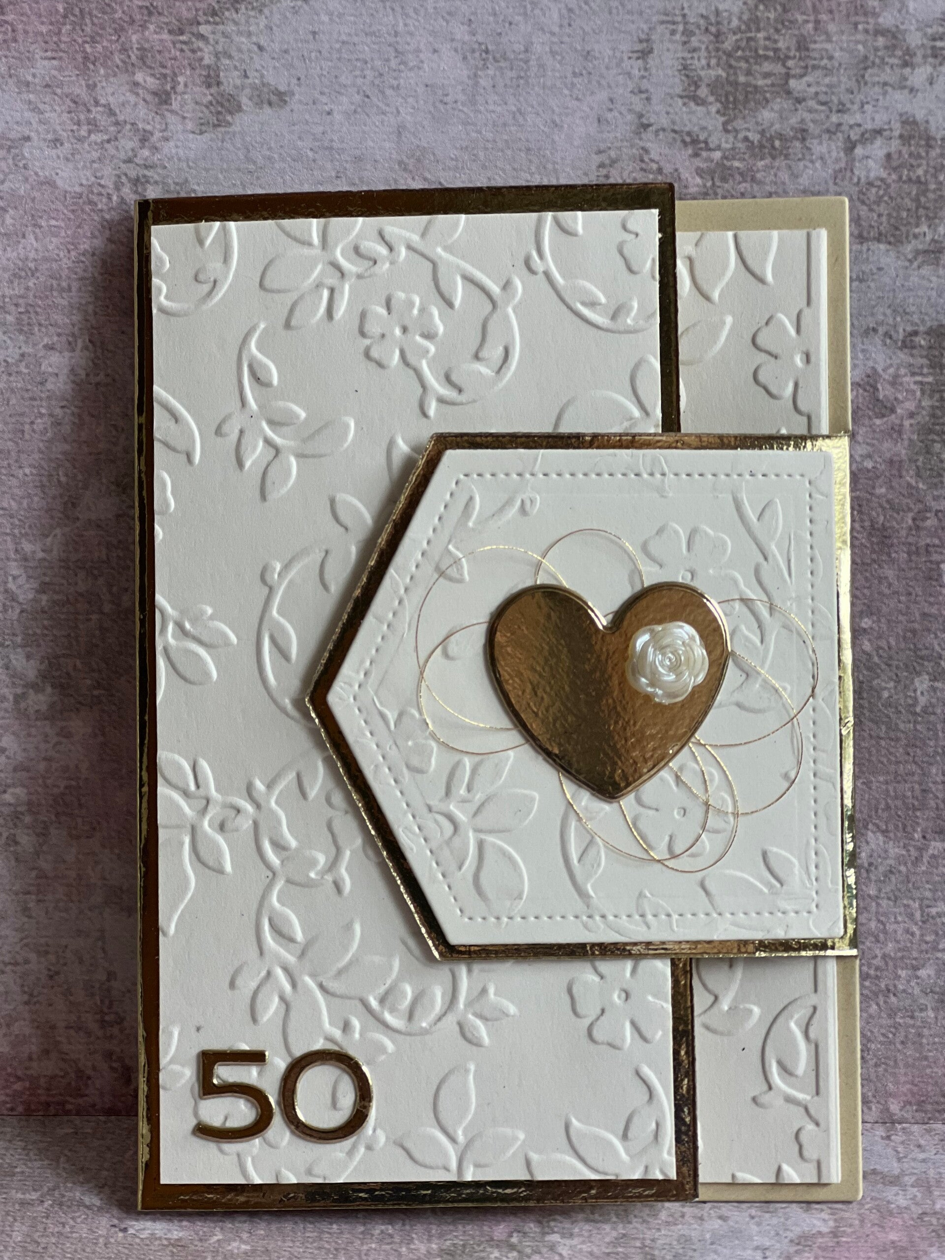 Dit kaartje bestemd voor een echtpaar dat 50 jaar getrouwd is, men noemt dit een goude huwelijk, vandaar dat de goude kleur in het kaartje is verwerkt. Een mooi moment om bij stil te staan.