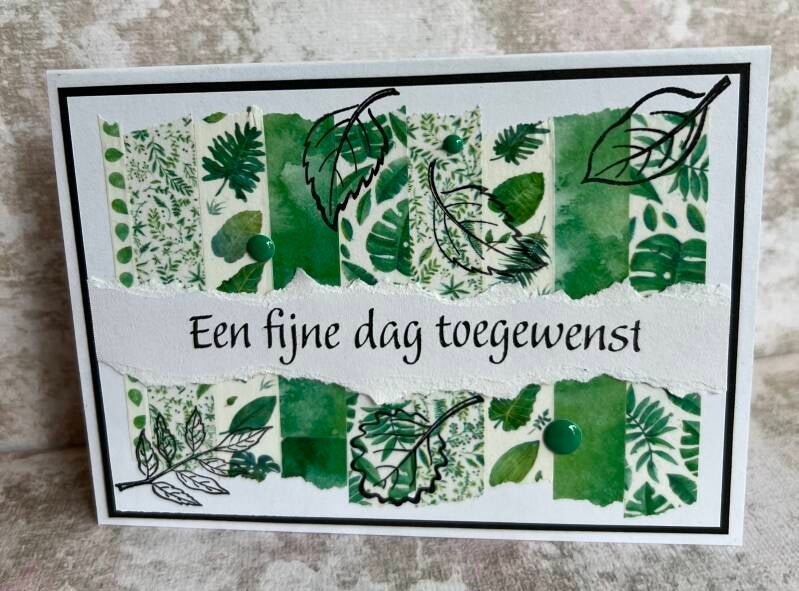 Dit groen witte kaartje in gemaakt van bij elkaar passend tape waarop bladeren staan. Om iemand een gezellige dag toe te wensen.