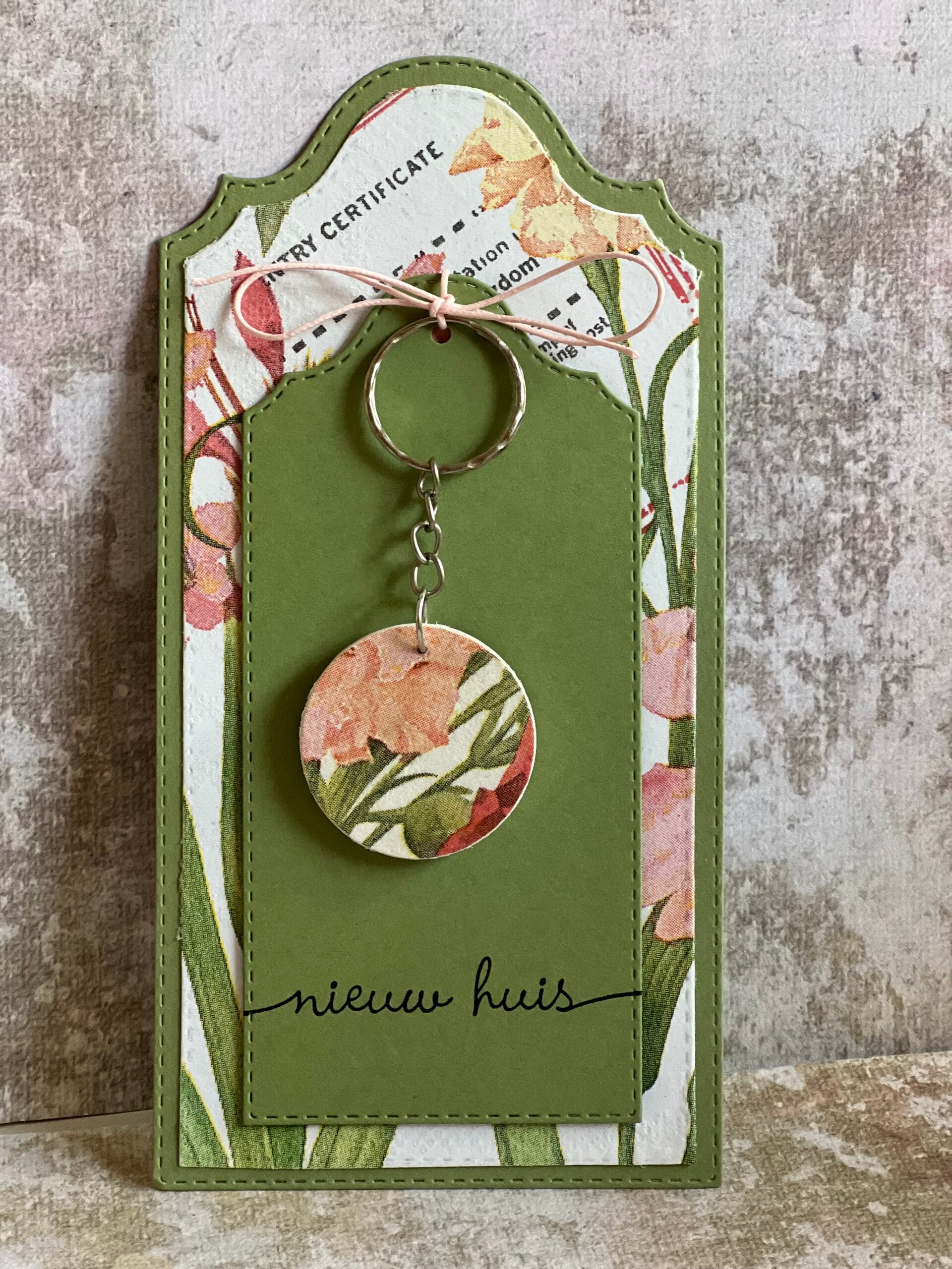 Aan dit labelkaartje met de tekst: "nieuw huis" hangt een sleutelhanger, op het rondje, dat aan de sleutehanger hangt, is een servet geplakt ook wel decoupage techniek genoemt zo is ook de middelste label voorzien van dezelfde servet als op de sleutelhanger zit.