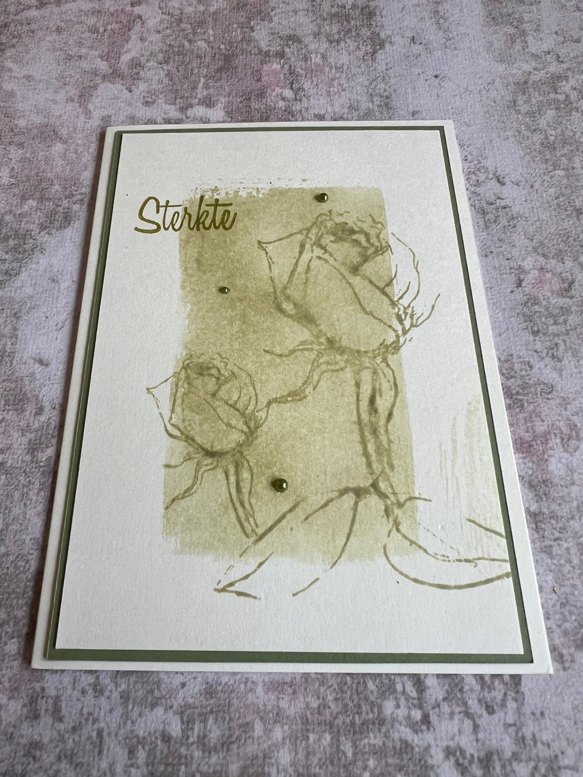 Dit kaartje in groen tinten en kleine groene pareltjes met de tekst:"sterkte" om iemand te laten weten dat je aan ze denkt.